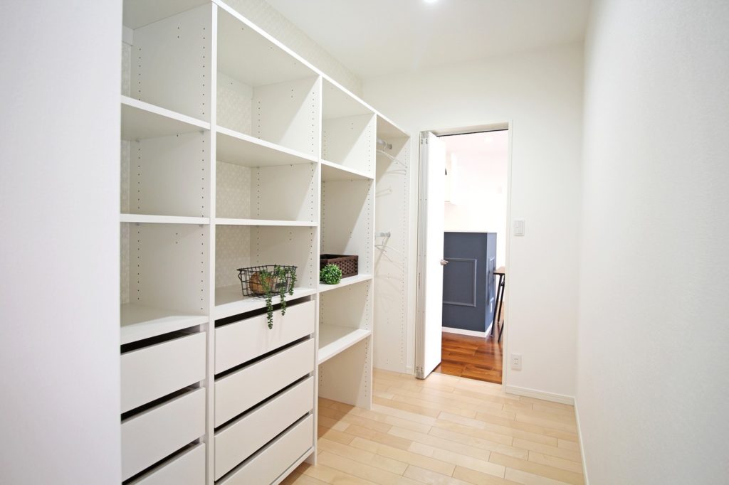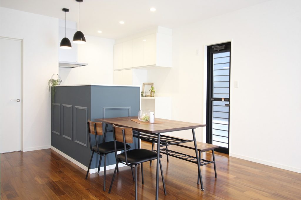 05_ニューヨークスタイルのシンプルな平屋 2025.07.08 ニューヨークスタイルのシンプルな平屋 深みのあるチーク柄の床に、モールディングを施したネイビーのキッチンカウンターがアクセントに 家の中央に大容量のウォークインクローゼットLDKと寝室の両側から行き来が可能 施工事例をもっと見る⇀